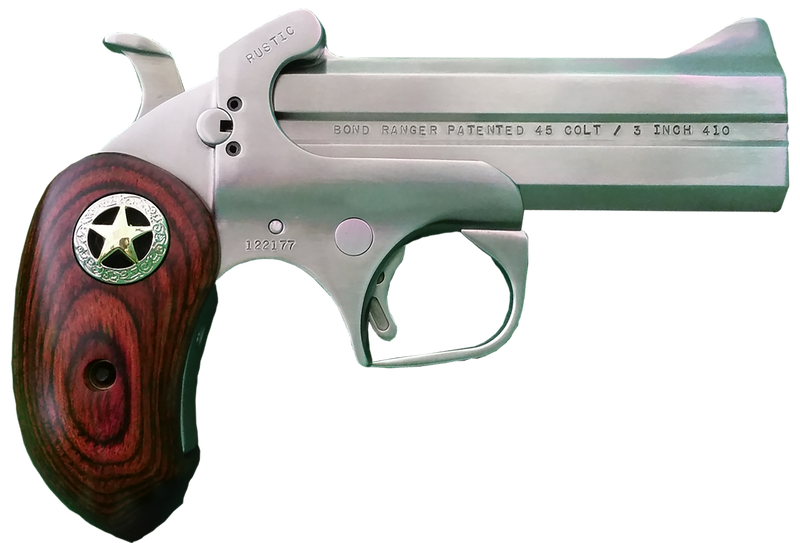The Bond Arms Rustic Ranger is a break-action derringer chambered in .45 Colt and .410 Gauge with a 4.25" barrel and 2-round capacity. Features a stainless steel frame, fixed blade front and rear sights, rosewood extended two-tone star grips, and includes a leather premium driving holster. Overall length is 6.25" and weighs 23.5 ounces.