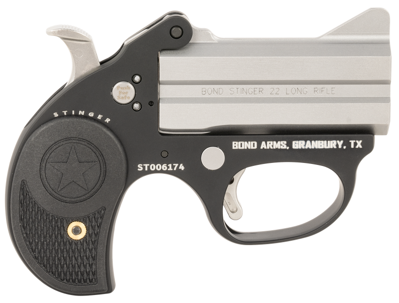 The Bond Arms Stinger is a break-action derringer chambered in .22 LR with a 3" stainless steel barrel and 2-round capacity. This lightweight handgun (14 oz) features an anodized aluminum frame, crossbolt safety, retracting firing pins, and black rubber grips, making it suitable for concealed carry and self-defense applications.