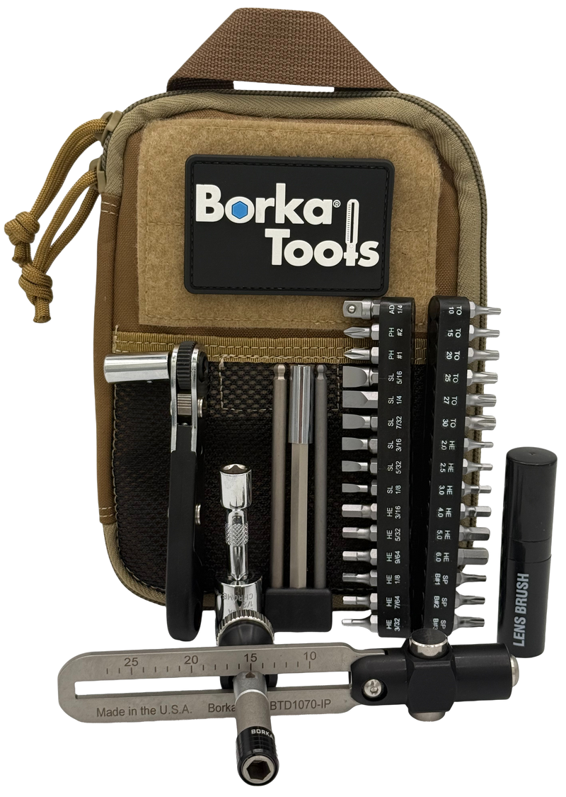 Adjustable torque driver tool kit designed for precision work on firearms and mechanical assemblies. Includes a cordura nylon pouch for storage and transport, and comes with a 3-piece extension bit set. Weighs 1 lb 6 oz with overall dimensions of 9.0" L x 6.0" W x 2.6" H.