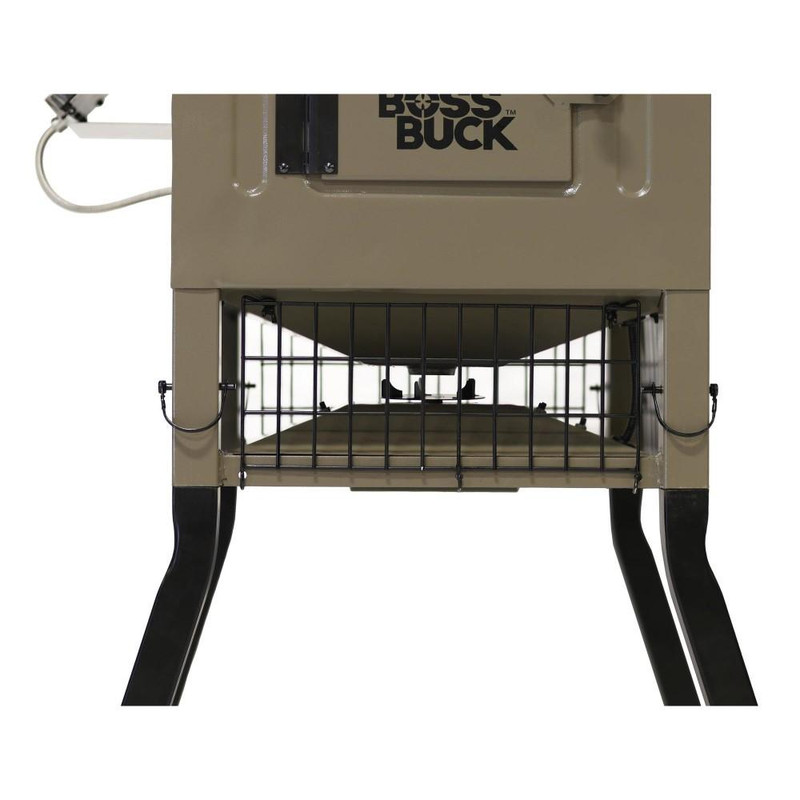 The Boss Buck Stand & Fill Sled Feeder is a 300lb capacity spinner feeder constructed from powder-coated steel with aluminum and polymer components for durability and weather resistance. It features a spin plate diverter for efficient feed dispersion, varmint guard, programmable timer with 2 quick-set programs and 16 customizable slots, and is powered by a rechargeable 12V battery with included solar panel. The sled design includes a secure latch lid, anchor holes, and tow hook slots for easy transport and placement.