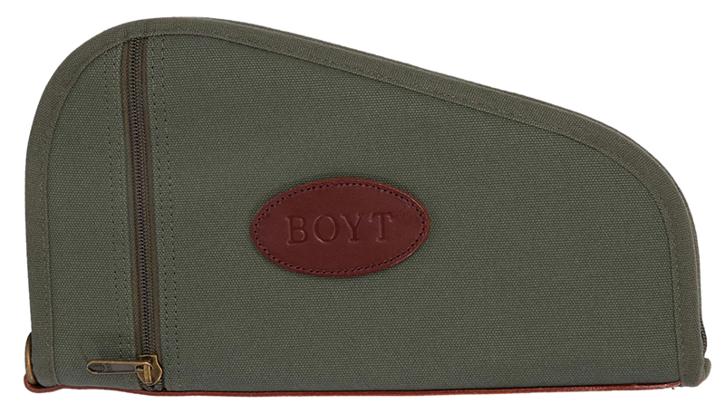 This Boyt Harness pistol rug is a compact protective case measuring 14" in length with OD Green finish. Features a heart-shaped design with zipper closure for secure storage and transport of handguns. Dimensions are 17.5" L x 11.2" W x 2.0" H.