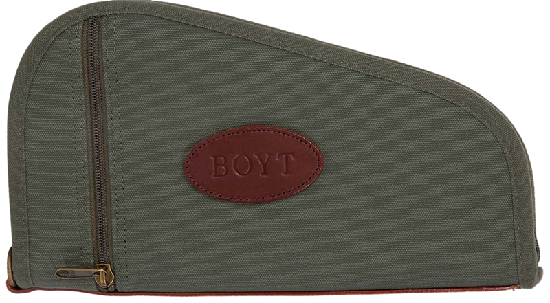 Boyt Harness OD Green canvas pistol case designed to hold a single handgun with protective padding throughout. Features a full-length zipper for secure access and measures 13.0" L x 9.5" W x 2.2" H.