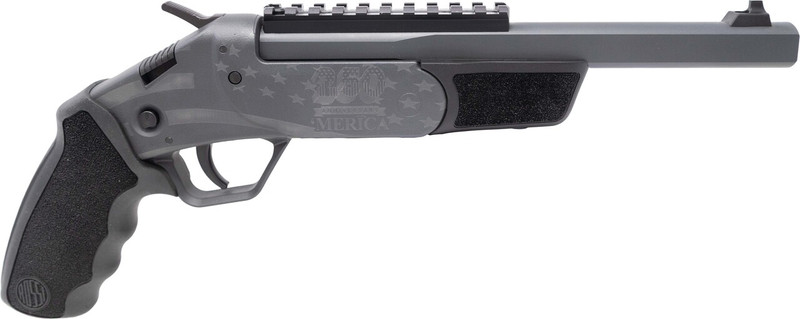 The Rossi Brawler 250th Edition is a break-action single-shot pistol chambered in .45 Colt/.410 Bore, featuring a 9" rifled barrel and polymer frame with black rubber grips. This exclusive 250th Edition model includes laser engraving on the stock and is equipped with a Picatinny rail rear sight and interchangeable front sight for customizable aiming options.
