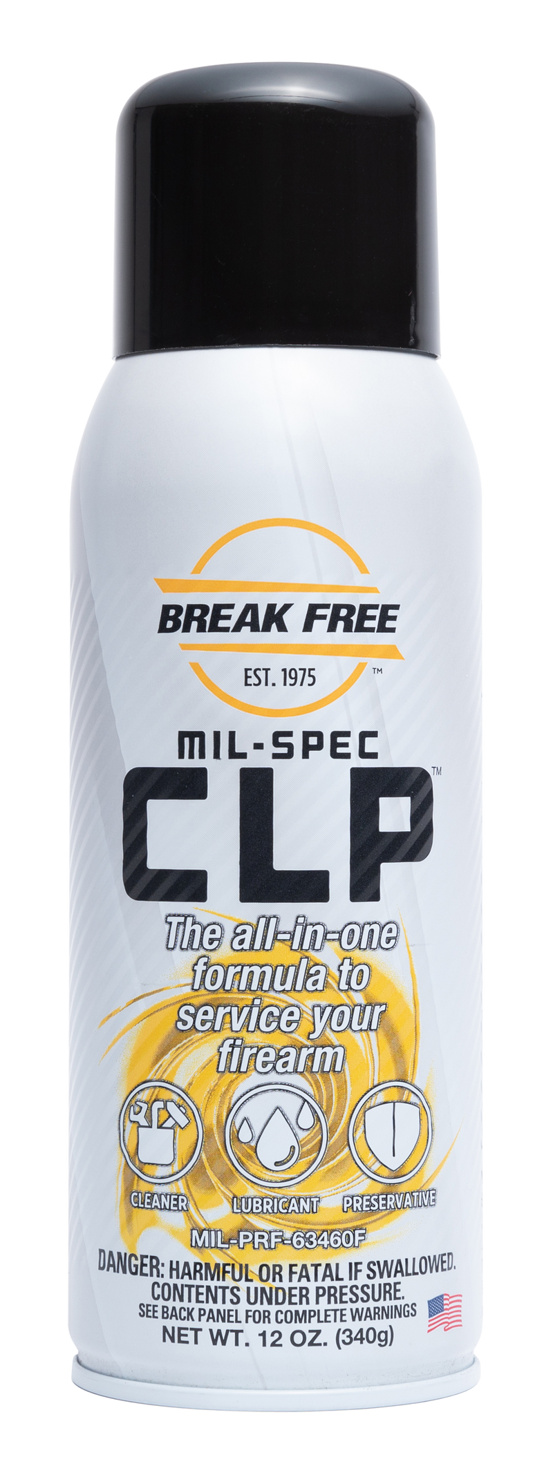 Break-Free CLP is a three-in-one cleaner, lubricant, and preservative formulation designed for firearm maintenance. The 12 oz aerosol penetrates metal surfaces to remove contamination while providing lubrication and corrosion protection. This product is California Prop 65 compliant and requires ground shipping due to hazmat aerosol classification.