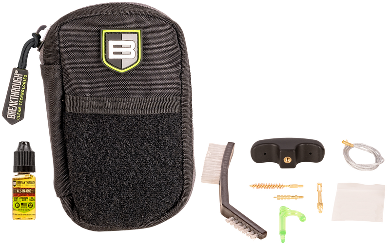 The Breakthrough Clean Badge Pull Thru Kit is a compact 10-piece cleaning system designed for 9mm firearms. This portable nylon case kit provides essential cleaning components for field or home maintenance of 9mm pistols and rifles. The compact design makes it suitable for range bags or emergency cleaning supplies.