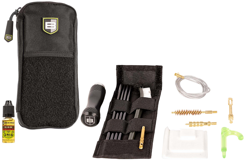This 9-piece cleaning kit from Breakthrough Clean features a badge rod and pull-through design configured for .338 caliber firearms. The kit comes in a compact nylon case measuring 9.5" x 4.5" x 3.0" and includes all essential components for field or range cleaning and maintenance.