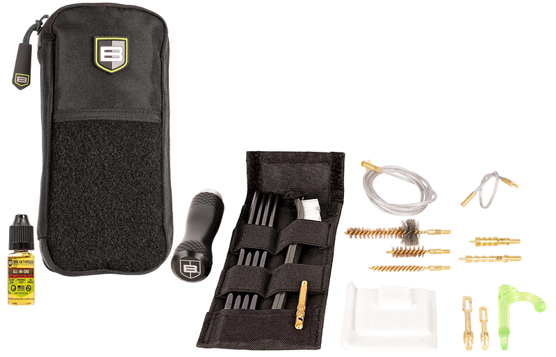 The Breakthrough Clean Badge Series is a 20-piece rod and pull-through cleaning kit designed for 5.56mm and 9mm firearms. Constructed with a durable nylon case material, this kit provides essential cleaning components in a compact, portable format suitable for field or home maintenance.