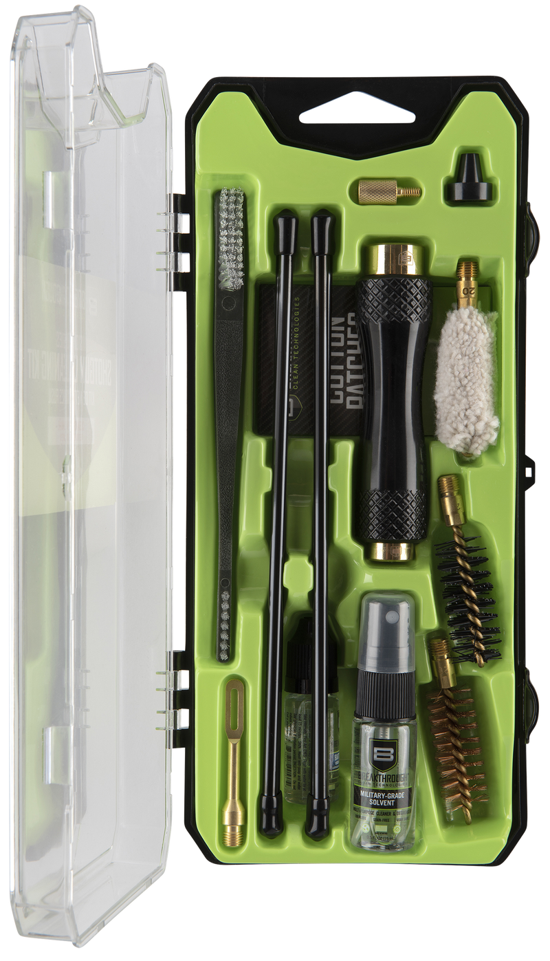 Complete 15-piece cleaning kit designed for 20 gauge shotguns, featuring cleaning rod sections, hard bristle nylon brushes, jags, patch holders, and cotton patches. Includes an aluminum handle and mini bottles of Breakthrough Military-Grade Solvent and Battle Born High-Purity Oil. Comes in a durable plastic storage box for organized transport and storage.