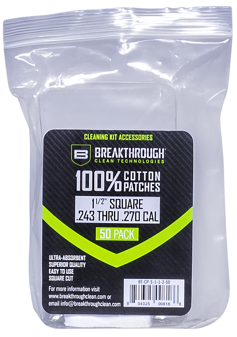 Cotton cleaning patches designed for rifles in 243 and 270 caliber, sized 1.5" square for use with standard cleaning rods. Pack contains 50 patches suitable for bore cleaning and general firearm maintenance.