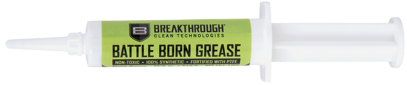 Battle Born Grease is a pure synthetic lubricant formulated with sub-micron PTFE particles to protect firearms against wear, corrosion, friction, and moisture across an operating temperature range of -75°F to +510°F. The odorless, non-toxic grease is supplied in a convenient 12cc syringe for precise application to firearm components. Contains California Prop 65 chemical (di-n-hexyl phthalate).