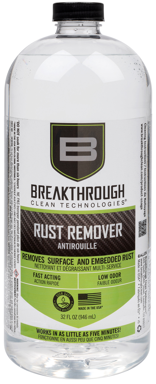 A water-based rust remover solvent in a 6-ounce pump spray bottle designed for fast-acting cleaning and corrosion removal on firearms and metal surfaces. The formula begins working in approximately 10 minutes and is safe for use on plastic, PVC, Viton, and most paint finishes. This eco-friendly solvent is suitable for both precise application and soaking, with extended soaking times available for deeper cleaning.