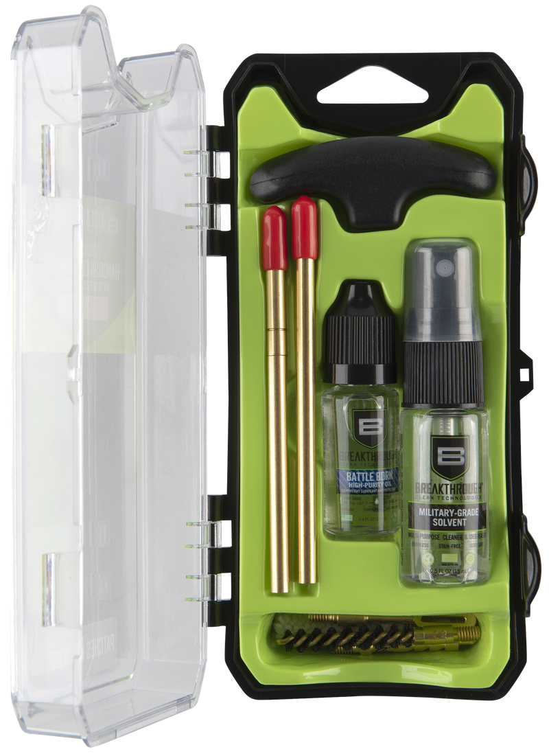 This compact cleaning kit includes cleaning rod sections, hard bristle nylon brushes, jags, patch holders, and cotton patches organized in a durable plastic case. The kit features a polymer T-handle for easy grip and includes mini bottles of Breakthrough Military-Grade Solvent and Battle Born High-Purity Oil. Designed for .22 caliber pistols with 10 pieces total.