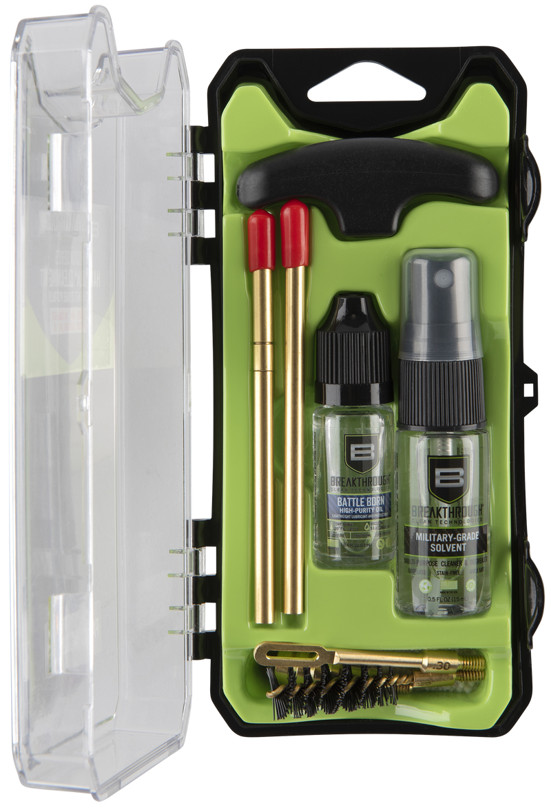 This compact cleaning kit is designed for .44 and .45 caliber pistols and includes cleaning rod sections, hard bristle nylon brushes, jags, patch holders, cotton patches, a durable polymer T-handle, and mini bottles of Breakthrough Military-Grade Solvent and Battle Born High-Purity Oil. All components are organized in a plastic tray housed in a durable plastic case for convenient storage and portability.