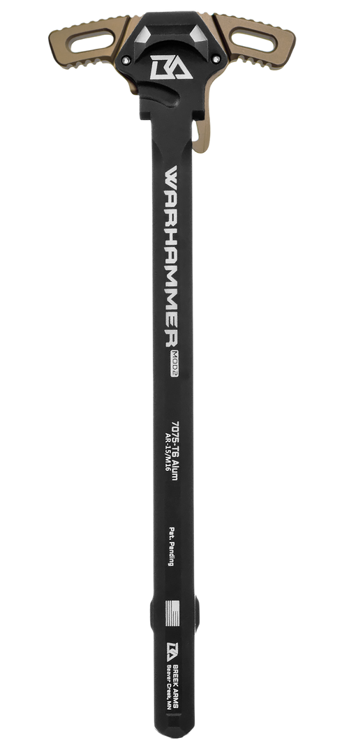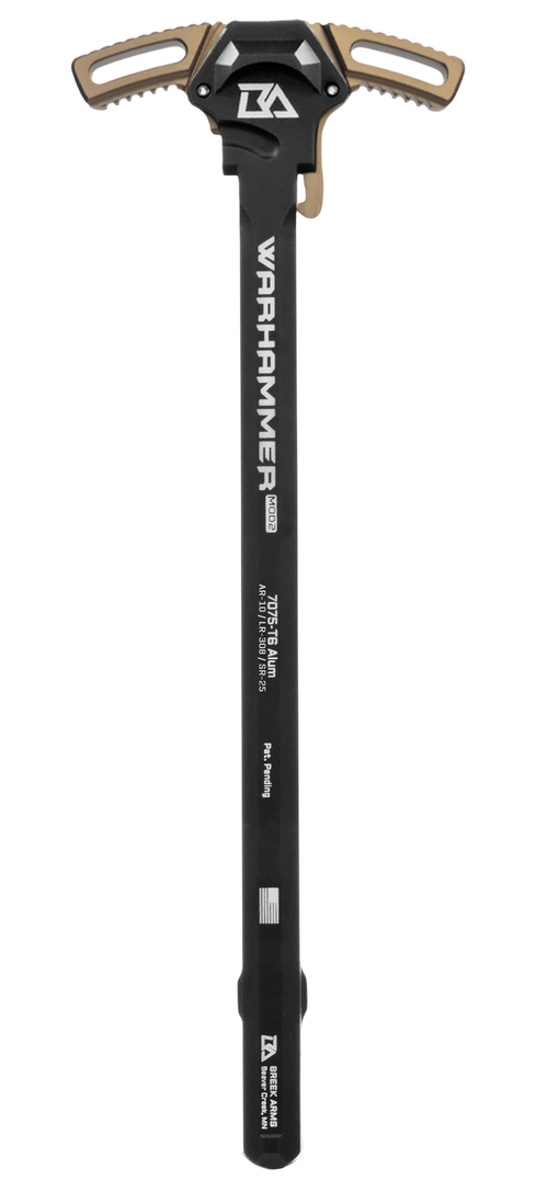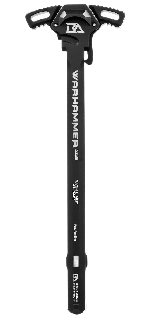 The Breek Arms Warhammer Mod2 is an ambidextrous charging handle designed for AR-10 and LR-308 platforms. Constructed from 7075-T6 aluminum with OD green finish, it measures 9.9" in length with a 3.7" width and 0.6" height. This handle provides a wide, ergonomic grip for reliable operation from either shoulder.