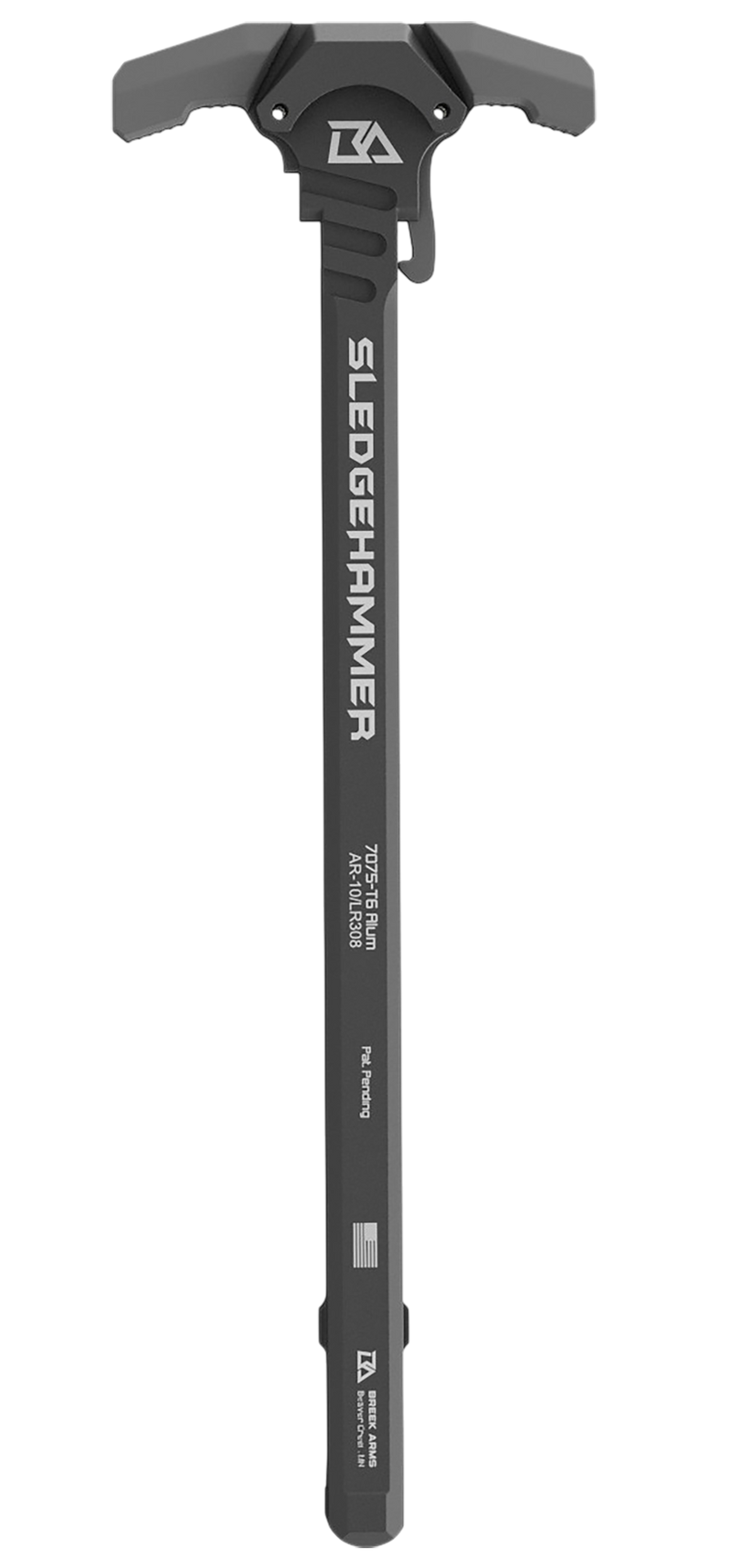 The Breek Arms Sledgehammer is a charging handle designed for AR-10 and LR-308 platforms, constructed from 7075-T6 aluminum for durability and lightweight performance. Featuring a gray anodized finish, it measures 9.4" in length with a 3.7" width and 0.7" height for ergonomic operation. This charging handle provides a robust interface for reliable bolt carrier manipulation.