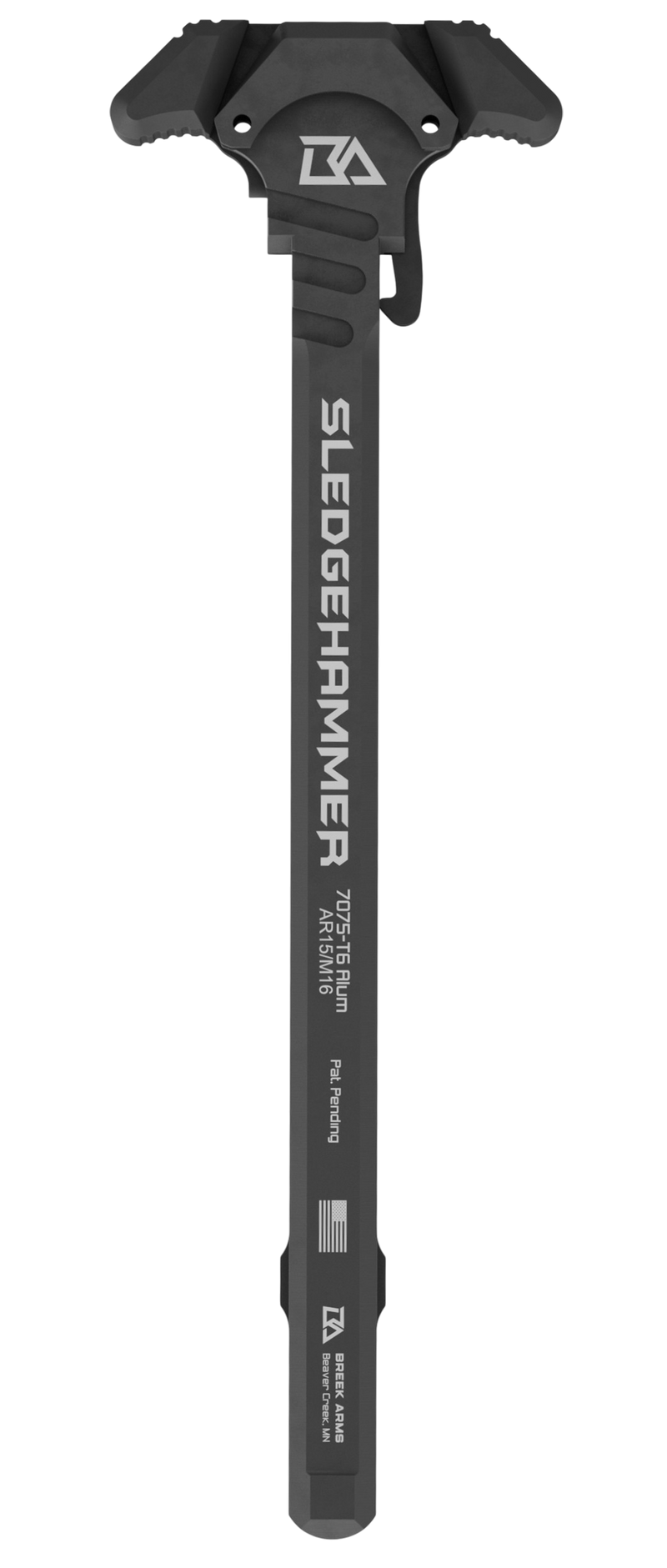 The Breek Arms Sledgehammer LE is an ambidextrous charging handle designed for AR-15 platforms, constructed from 7075-T6 aluminum for durability and lightweight performance. It features a latch mechanism and measures 8.7" in length with a 3.7" width, providing enhanced ergonomics for both left and right-handed shooters. Installation is direct fit to standard AR-15 upper receivers.
