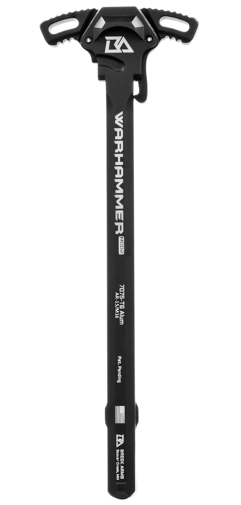 The Breek Arms Warhammer Mod2 Micro is an ambidextrous charging handle designed for AR-15/M16 rifles, machined from 7075-T6 aluminum with textured grooves for secure grip even with gloves. The smaller micro latches prevent snagging on gear, slings, or barriers. Installation is direct to standard mil-spec AR-15 charging handle receivers.