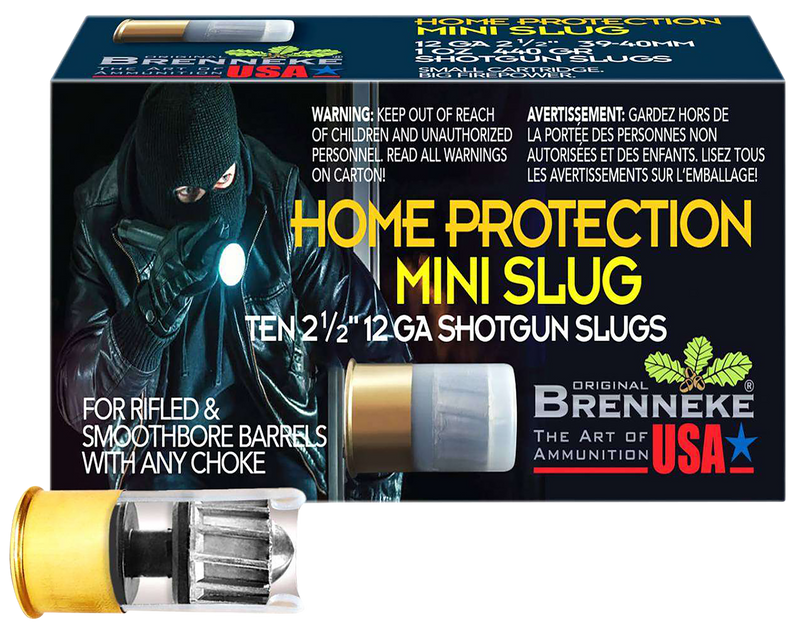 Brenneke SL122MS Home Protection Mini Slug ammunition is a 12 gauge slug load designed for home defense applications. Each box contains 10 rounds with a muzzle velocity of 1334 fps, delivering controlled penetration suitable for close-range defensive use.