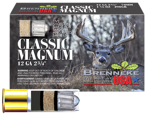 Brenneke SuperSabot shotshells are 12 gauge 3" magnum loads featuring 1 1/8 oz sabot slugs designed for hunting applications. These rounds deliver a muzzle velocity of 1526 fps and are ideal for deer and large game hunting. Each box contains 5 rounds.