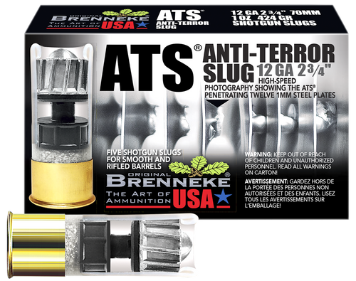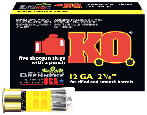 Brenneke K.O. 20 gauge shotshell slug ammunition delivers a 3/4 oz lead slug at 1550 fps muzzle velocity from a 2.75" casing, designed specifically for hunting applications. These slugs provide consistent accuracy and stopping power for medium to large game hunting. Sold in boxes of 5 rounds with 50 boxes per case.