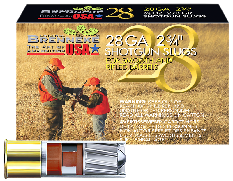 Brenneke 28 Gauge shotshell loaded with a 5/8 oz slug for hunting applications. Fires at 1450 fps and comes in a 5-round box, ideal for hunting medium game at close range.