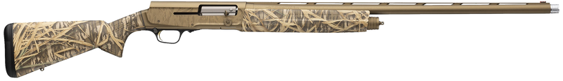 The Browning A5 Wicked Wing is a 12 gauge semi-auto shotgun chambered in 3.5" with a 26" barrel and 4+1 capacity. Features Burnt Bronze Cerakote finish on receiver and barrel, MO Original Shadow Grass composite camo stock, Kinematic Drive recoil operation, and Invector-DS Goose Band extended choke tubes. Weighs approximately 7 lbs with fiber optic front and ivory mid-bead sights.