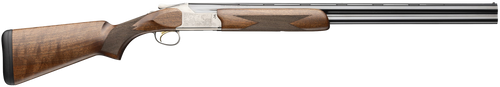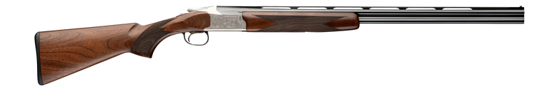 The Browning Citori 825 Field is a break-action over/under shotgun chambered in 410 bore with a 26" barrel and 2-round capacity. It features a polished blued finish, Grade II/III walnut stock with palm swell, silver nitride receiver, and low-profile engraved receiver with game scene engraving. The shotgun comes with three interchangeable choke tubes (F, M, IC Invector), ivory front and mid-bead sights, Fire Lite 2 trigger, and Inflex II recoil pad.