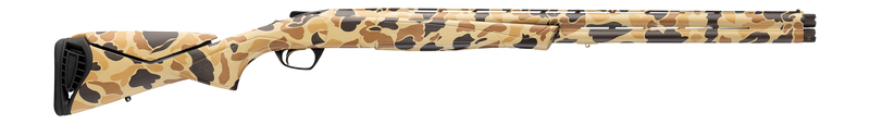 The Browning Cynergy is a 12 gauge over/under shotgun with a 26" barrel and 3.5" chamber, featuring a vintage tan camo finish with adjustable synthetic stock and comb. It includes Invector-Plus choke tubes (F, M, IC), a fully chrome-plated bore, Inflex recoil pad with .25" spacer, and ivory front and mid bead sights. Weight is 7 lbs. 6 oz. with an overall length of 43".
