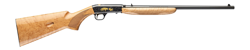 Semi-auto rimfire rifle chambered in 22 LR with a 19.4" blued barrel and 10+1 round capacity. Features Grade VI bird's eye maple furniture, gold-enhanced scroll engraving, adjustable open sights with gold bead front, and a gold-colored trigger. Weighs 5 lbs. 3 oz. with an overall length of 37", drilled and tapped for accessories.