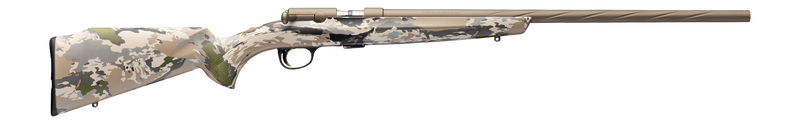 Lightweight bolt-action rimfire rifle chambered in 22 Magnum with a 22" spiral fluted barrel and suppressor-ready 1/2x28 threading. Features a Browning OVIX composite camo stock, Smoked Bronze Cerakote finish, and straight-pull bolt operation. Weighs 5 lbs 10 oz with an overall length of 40.25" and includes a Double Helix 10-round magazine.