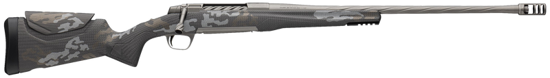 The Browning X-Bolt 2 Mountain Pro SPR is a lightweight bolt-action rifle chambered in 300 PRC with a 22" spiral fluted, threaded barrel (5/8x24) optimized for suppressors. It features a stainless steel receiver, carbon fiber stock with adjustable comb and length of pull, spiral fluted bolt, and includes a Recoil Hawg muzzle brake. The rifle weighs 6 lbs 5 oz with an overall length of 42.75" and three-position safety.