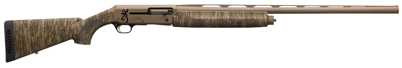Semi-automatic 12 gauge shotgun with 3.5" chamber and 26" back-bored ventilated rib barrel. Features a flat dark earth aluminum receiver with Mossy Oak Bottomlands synthetic stock, gold-plated trigger, and Invector-Plus flush choke tubes (F, M, IC included). Weighs 7.8 lbs with 47" overall length and brass bead front sight.