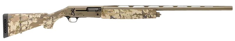 Gas-operated semi-auto shotgun chambered in 12 gauge 3.5" with a 28" ventilated rib barrel and 4+1 capacity. Features a Flat Dark Earth Cerakote finish on the barrel and receiver, composite stock with Browning AURIC camouflage pattern and textured gripping surfaces, and comes with three Invector-Plus choke tubes (F, M, IC). Weighs 7.9 lbs with an overall length of 49".