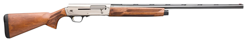 The Browning Maxus II Upland is a 12-gauge semi-automatic shotgun with a 3-inch chamber, 26-inch ventilated rib barrel, and 4-round capacity (2.75-inch shells). Features include a satin nickel aluminum receiver, Grade I Turkish walnut stock with adjustable shim for length of pull and cast, fiber-optic front sight with ivory mid-bead, and Invector-Plus flush chokes (Full, Modified, Improved Cylinder). The Power Drive Gas System provides reliable cycling with a total weight of 7 lbs.