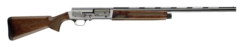 The Browning A5 Ultimate is a 12 gauge semi-automatic shotgun featuring a 26" back-bored ventilated rib barrel with a 3" chamber and 4+1 capacity. It includes a satin nickel engraved receiver, grade III Turkish walnut stock, fiber optic front sight with ivory mid bead rear, and comes with three Invector-DS choke tubes (Full, Modified, Improved Cylinder). Weighing 6 lbs 11 oz with an overall length of 47.625", it features Inflex Technology recoil pad and a shim-adjustable stock for customized fit.