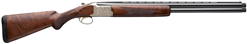 The Browning Citori Feather Lightning is a 12 gauge over/under shotgun with a 3" chamber, 26" blued barrels, and 2-round capacity. It features a lightweight alloy receiver with satin nickel finish and broad engraving, American black walnut stock with lightning-style grip, and comes with Invector-Plus extended choke tubes (Full, Modified, Improved Cylinder). The shotgun weighs 7 lbs and includes ivory bead front and mid-bead rear sights with a single selective trigger and hammer ejectors.