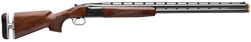 The Browning Citori CX Micro is a 12 Gauge, 3" chamber break-action over/under shotgun with a 30" back-bored vented rib barrel. It features a compact design with adjustable length of pull via Graco butt pad plate, Grade II American Walnut stock, and a polished blue steel receiver with gold accents. Includes three Invector-Plus Midas choke tubes (Full, Modified, Improved Cylinder) and weighs 8.3 lbs with a 60/40 point of impact suited for hunting and clay target sports.
