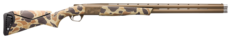 This Browning Cynergy Wicked Wing is a 12 gauge over/under shotgun with a 3.5" chamber, 26" ventilated rib barrels, and 2-round capacity. It features a burnt bronze Cerakote metal finish paired with a vintage tan camo composite stock, adjustable comb, and Inflex recoil pad with 1/4" spacer. Includes three Invector-Plus Extended choke tubes (F, M, IC), fully chrome-plated bore, and weighs 7.6 lbs.