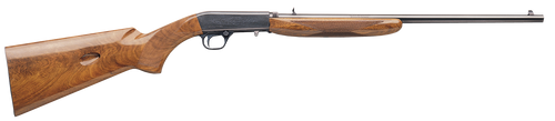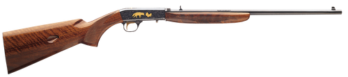 The Browning SA-22 Grade II is a semi-automatic .22 LR rifle with a 19.375" octagonal barrel and 10+1 round capacity. Features a satin nickel receiver, gloss walnut wood stock, adjustable folding leaf rear sight with gold bead front sight, and a takedown design. Weighing 5.3 lbs with a 37" overall length, this rifle combines classic Browning craftsmanship with reliable blowback operation.