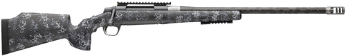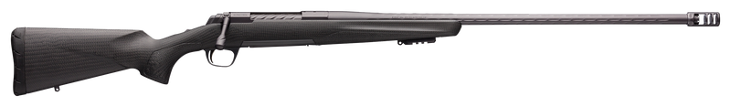 The Browning X-Bolt Pro Long Range is a 6.5 Creedmoor bolt-action rifle with a 26" heavy barrel, 4+1 capacity, and spiral fluted bolt for smooth operation. It features a Carbon Gray Elite Cerakote finish, natural carbon fiber stock, adjustable Feather trigger, and Recoil Hawg muzzle brake. The rifle is drilled and tapped for optics with an X-Lock scope mount, weighs 6.12 lbs, and has an overall length of 46".