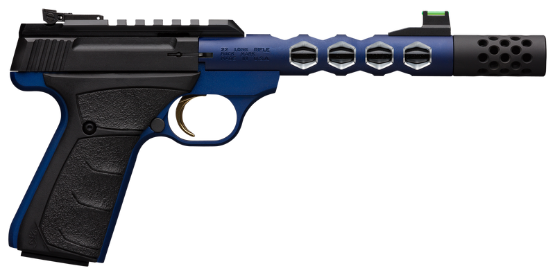 Single-action semi-auto pistol chambered in .22 LR with a 5.9" threaded, suppressor-ready barrel featuring honeycomb cuts and a removable muzzle brake. Optic-ready with Picatinny rail, fiber-optic front sight, and adjustable rear sight; equipped with black UFX over-molded grips and weighs 31 oz. Blue anodized aluminum frame and slide with 10+1 round capacity.