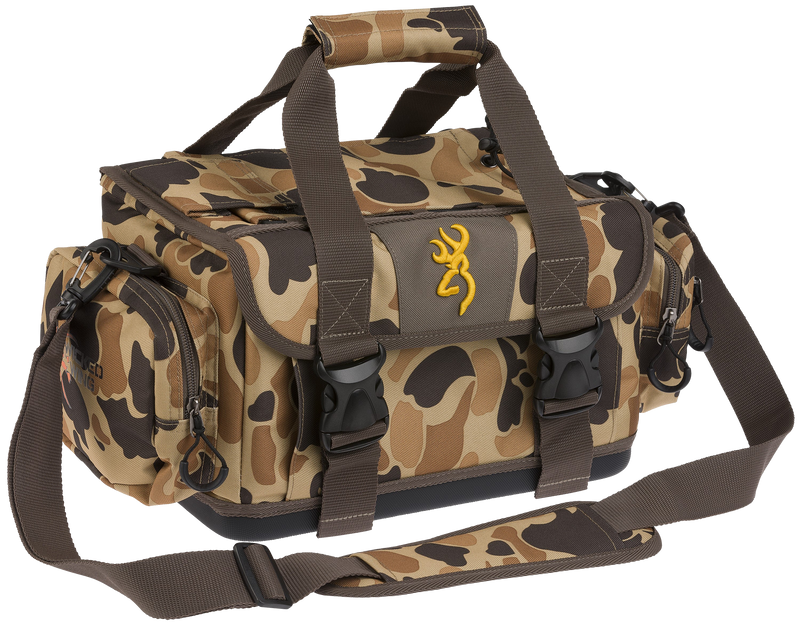 The Browning Wicked Wing Blind Bag is a 12-inch polyester carrying bag designed for transporting shooting accessories and gear. Featuring a vintage tan color with a full-length zipper closure, this bag measures 17.3" L x 15.6" W x 8.8" H and provides practical storage for range or field use.