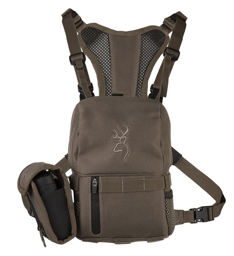 The Browning Speed Bino Hub is a harness-style binocular carrying case designed to securely hold binoculars and rangefinders during outdoor activities. Featuring major brown coloring, it measures 10.5" x 4.5" x 7.6" and provides quick-access storage with a dedicated rangefinder case compartment. The harness design allows for hands-free carrying while maintaining easy access to your optics.