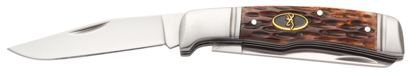 The Browning Joint Venture is a dual-blade folding knife featuring a 2.88" drop point/spey point blade made from 8Cr13MoV stainless steel with a plain edge. The brown jigged bone handle and stainless steel frame provide durability and a classic appearance, with a total open length of 6.63" and nail nick opening mechanism.