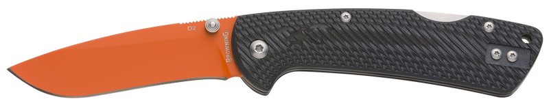 This Browning Back Country fixed blade knife features a deep belly skinner blade made from D2 steel with a plain edge, ideal for field dressing and skinning tasks. The knife has a full tang construction with a G10 handle and comes with a Kydex sheath for secure carry and protection. Overall length is 6.63 inches with a blade width of 3.6 inches.
