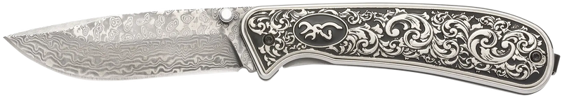 The Browning Grand Pass is a folding knife featuring a 3.50" Damascus steel drop point blade with a thumb stud opening mechanism. The handle is crafted from engraved stainless steel, providing both durability and aesthetic appeal. Overall length is 7.50" when open, making it suitable for general cutting tasks and everyday carry.
