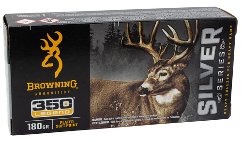 Browning Silver series centerfire rifle ammunition in 300 Winchester Magnum with 180-grain plated soft point bullets. Delivers 2960 fps muzzle velocity and 3501 ft-lbs of energy, suitable for hunting applications. Packaged 20 rounds per box, 10 boxes per case.