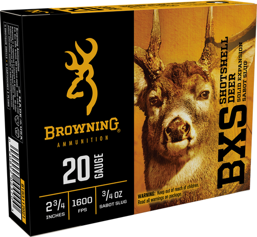 Browning BXS 12 Gauge shotshell ammunition loaded with 1oz sabot slugs in 2.75" casings, designed for deer hunting applications. These rounds deliver 1600 fps muzzle velocity for effective medium-range hunting performance. Packaged 5 rounds per box for controlled ammunition management during hunts.