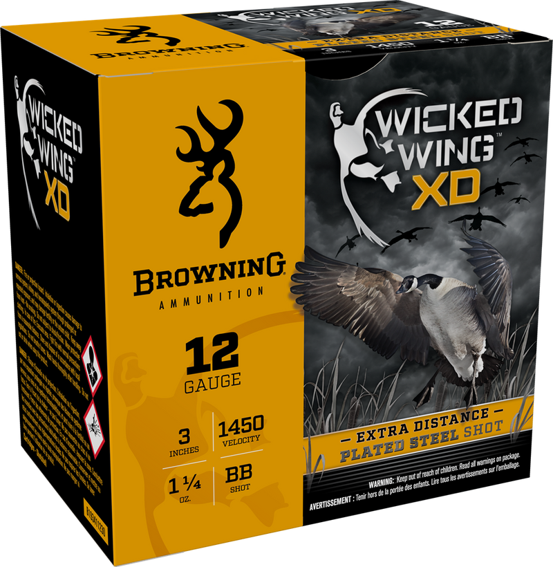 Browning Wicked Wing XD shotshells are designed for waterfowl hunting with steel BB shot at 1450 fps muzzle velocity. These 12 gauge 3" magnum loads deliver the extra distance performance needed for hunting applications. Steel construction makes them suitable for use in most modern shotguns.