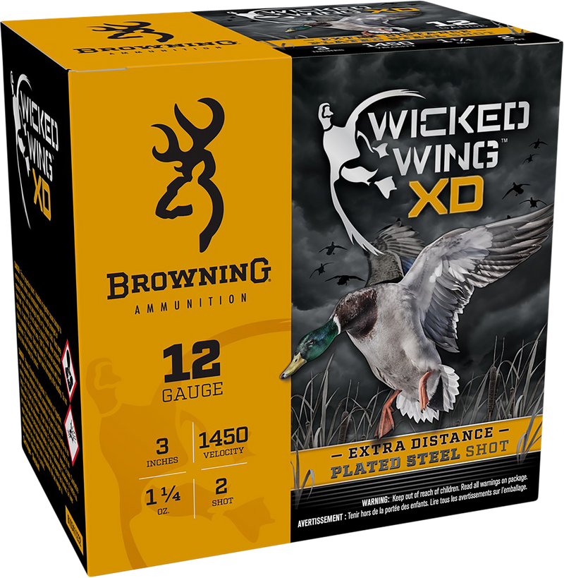 Browning Wicked Wing XD ammunition is a 12 gauge shotshell loaded with 1 1/4 oz of #2 steel shot, designed for waterfowl hunting at extended distances. The steel shot construction makes this round non-toxic and suitable for use in environmentally sensitive areas. Loaded to 1450 fps muzzle velocity, these shells deliver consistent performance for pass shooting and decoying applications.